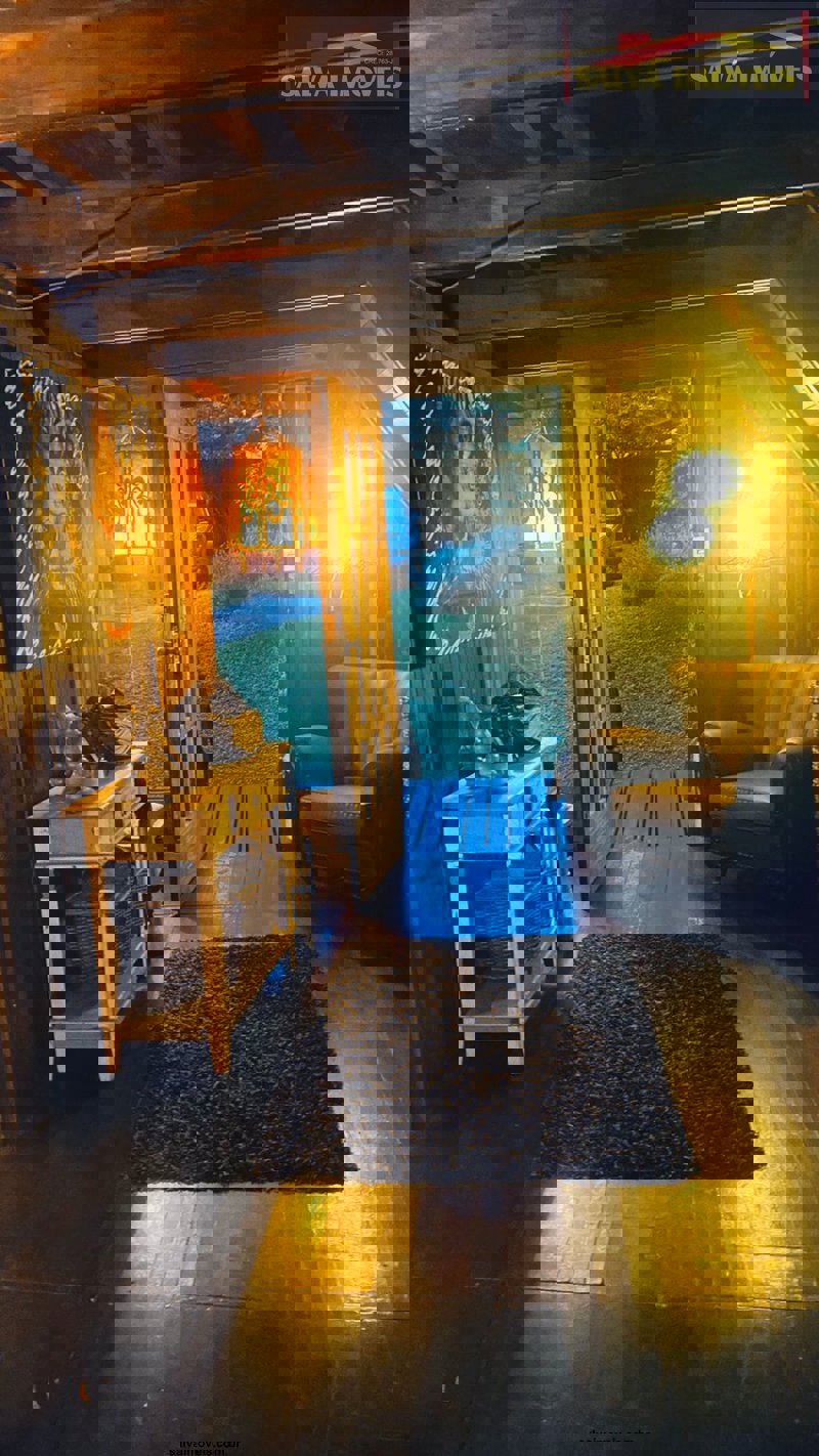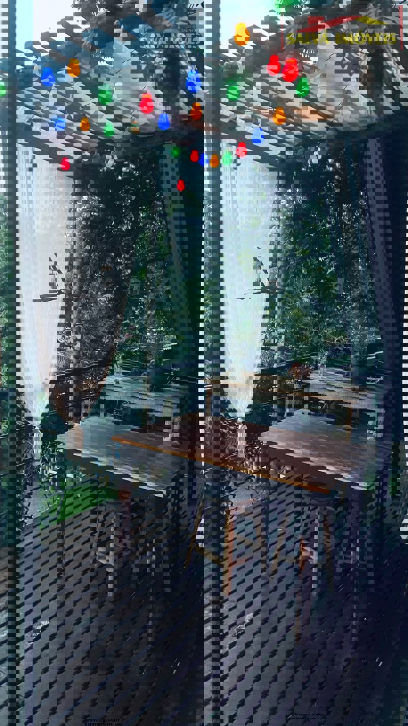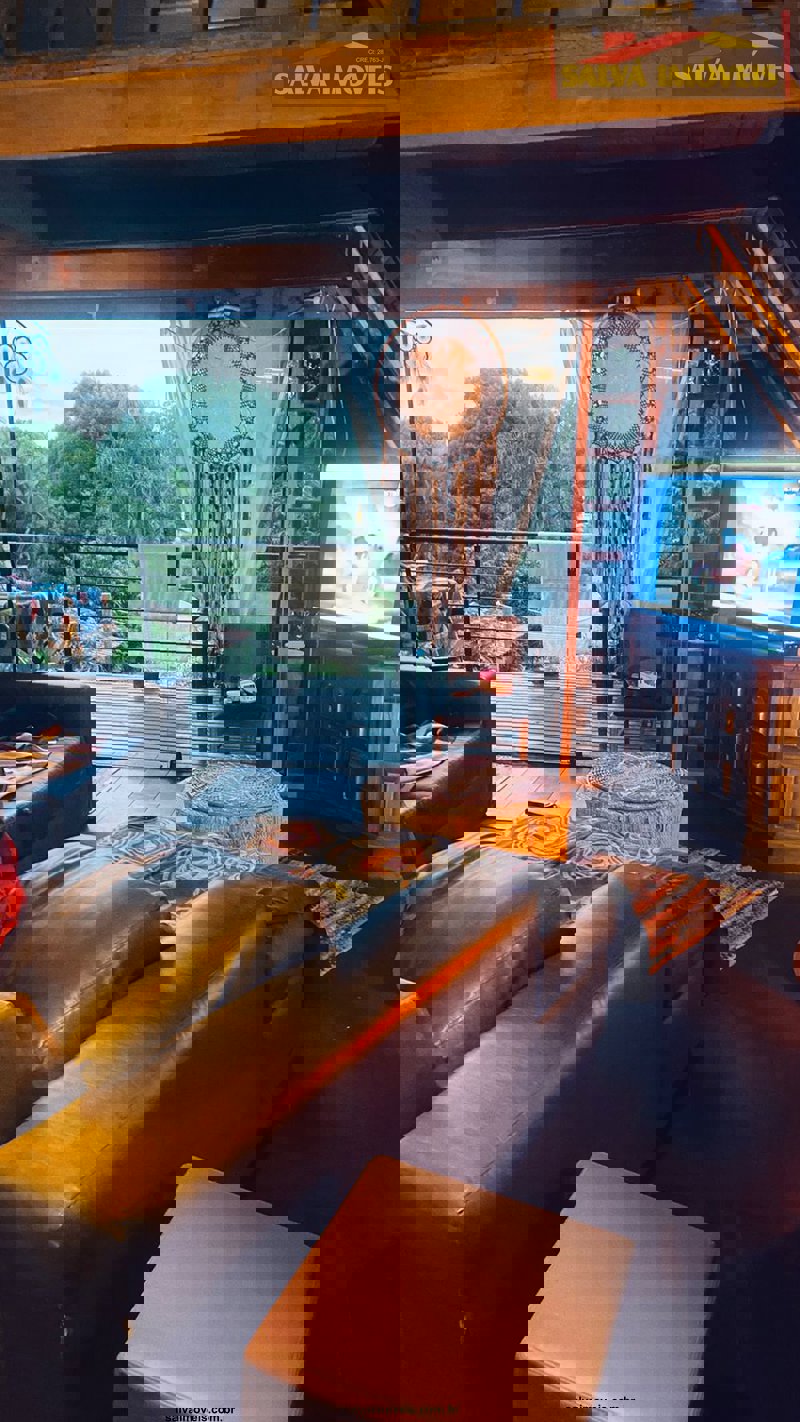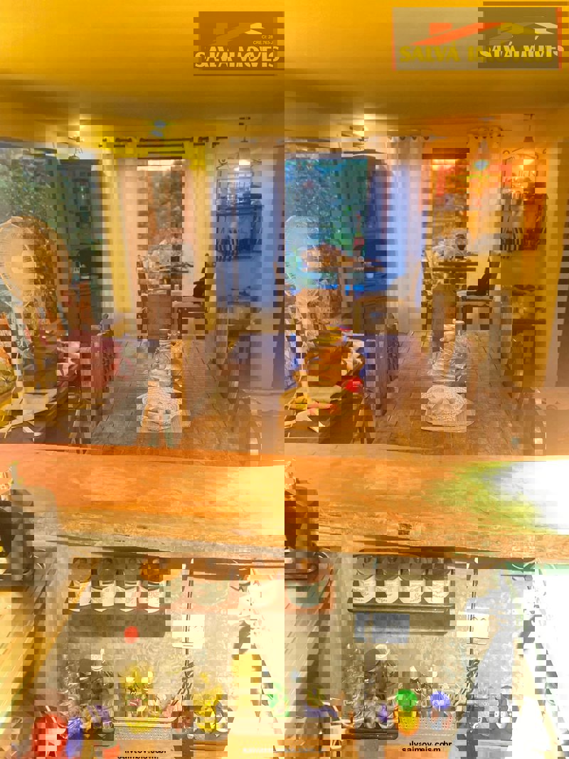 O chalé é casado da casa e jardim...totalmente mudado ou seja, fora do normal ou padrão, mede 100 metros quadrados no madeiramento embuia.